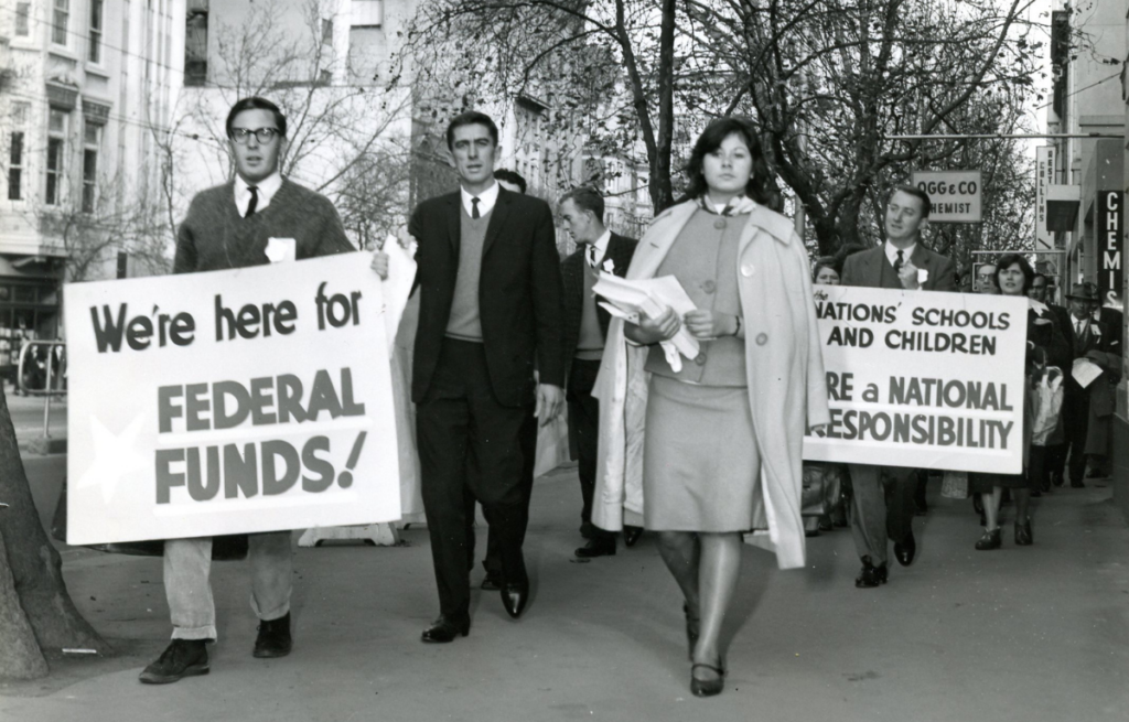 Amid growing concern that politicians were prepared to fund state aid to non-state schools in order to buy votes, nearly 4000 people attended a state aid protest meeting at Sydney Town Hall in August 1969, with the overflowing crowd accommodated at Federation’s headquarters. A speaker said the purpose of the Public Instruction Act 1880 was for “equal opportunity for all children, however, with the population explosion…and the provision of state aid, the state school system is dying a slow strangulation.”